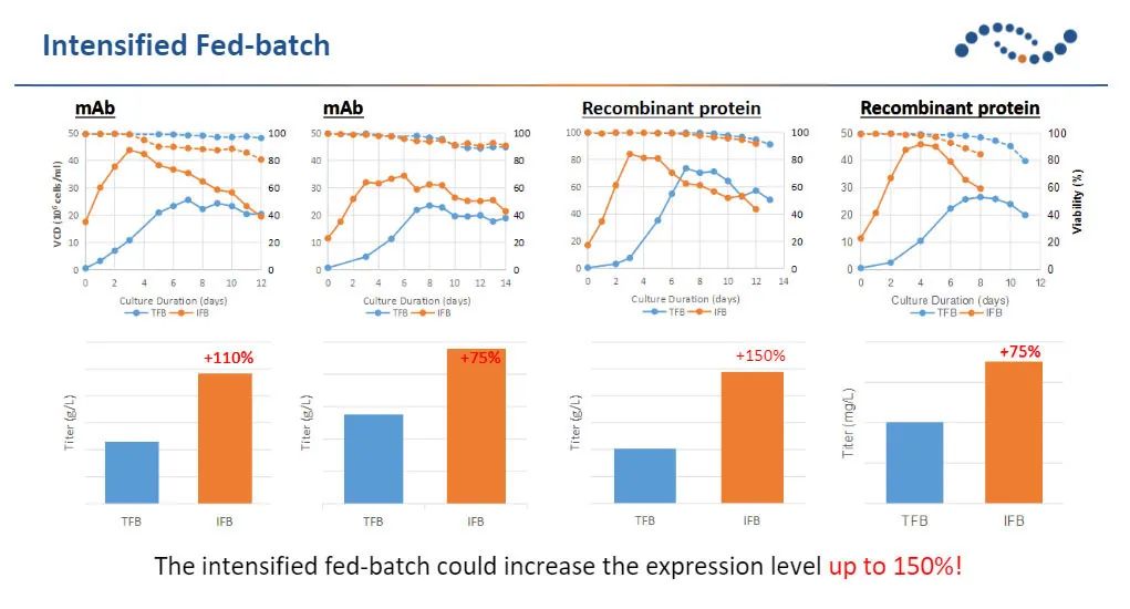 透过强化型的补料批培养,并结合细胞生长特性, 生长代谢的监控,  可以在与传统的工艺方式相同的培养周期, 提高蛋白质表达量超过70%。